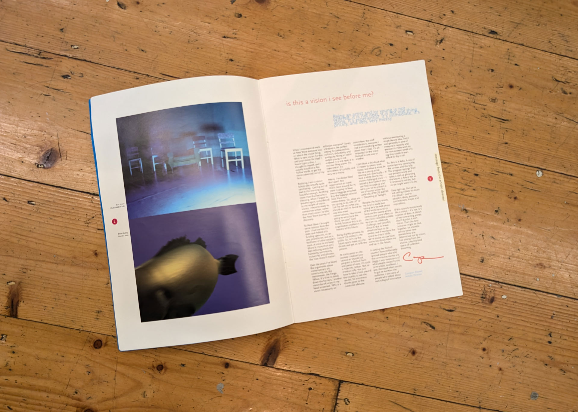 The Intertwining and reflective. The complex and compelling identity of the 2000 Next Wave Festival, called Wide Awake - Dreaming at Twilight, was directed by Campion Decent.